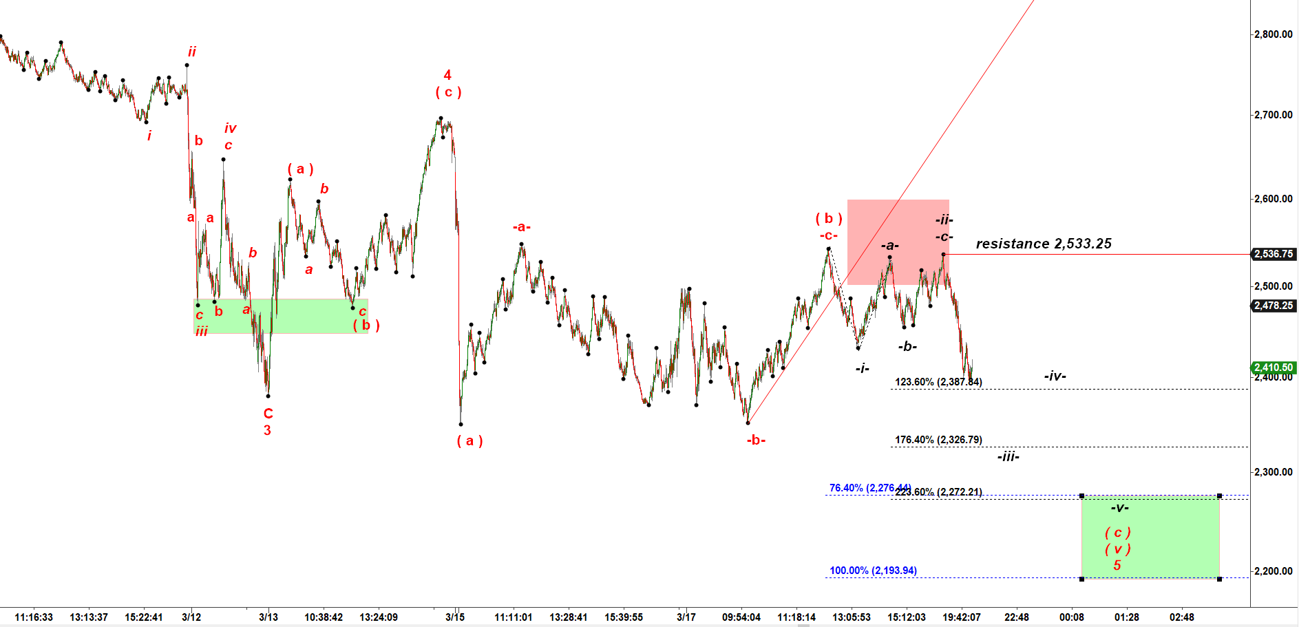 The very same comments are fully applied to the chart of ES-mini shown below, As long ES stays under its critical resistance, the top made at 2,533.25 I am looking for it to make a new lower low in the very final push down in subwave ( c ) of wave ( v ) down.