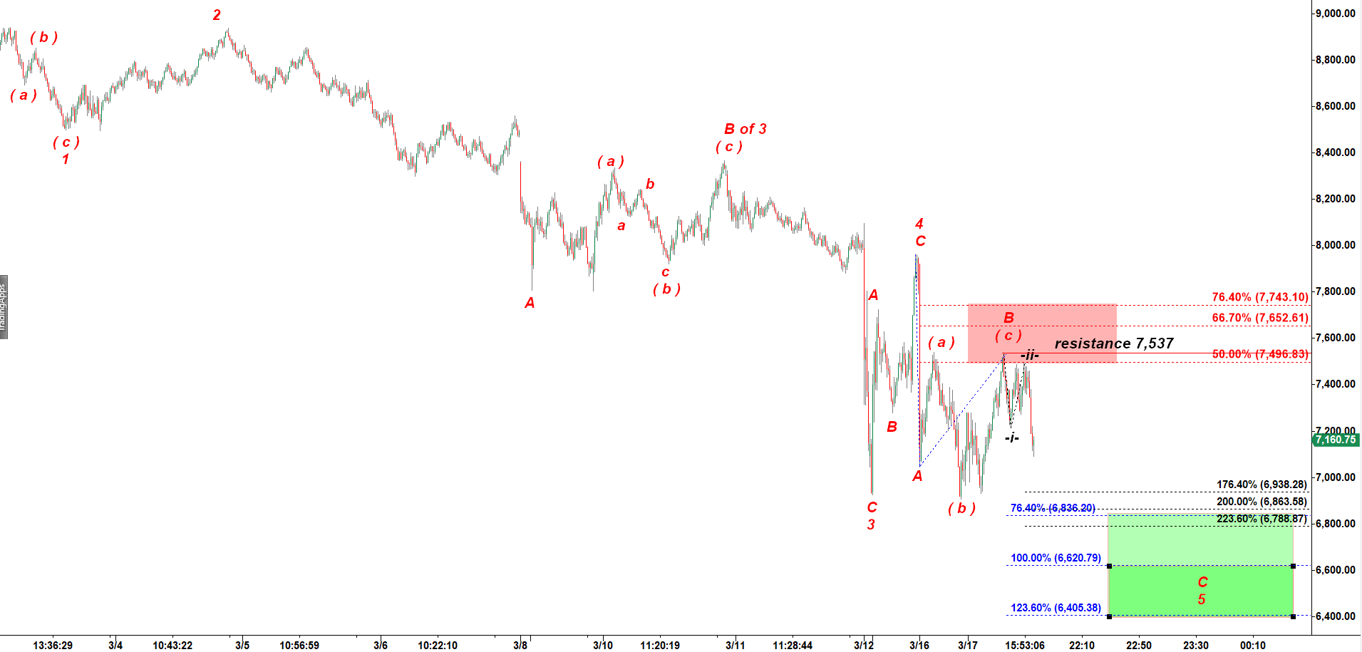 We should expect an impulsive decline structured as five wave down fractal off the top made at 7,537 at 12:21 PM on Tuesday.