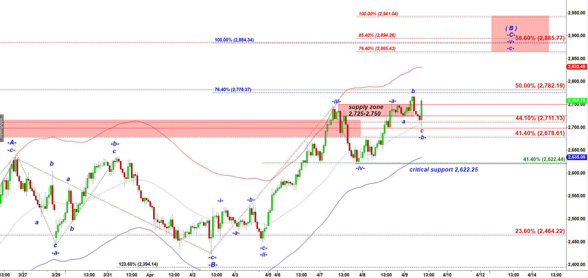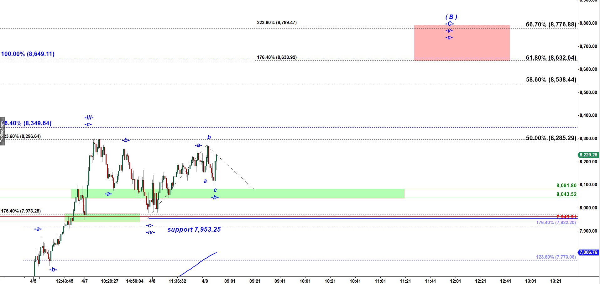 NQ has the very same micro count. A corrective subwave -b- down is also structured as an Expanded Flat. This move up looks like a start of the final subwave -c- of wave -v- up targeting the Red Target box starting at 8,630.