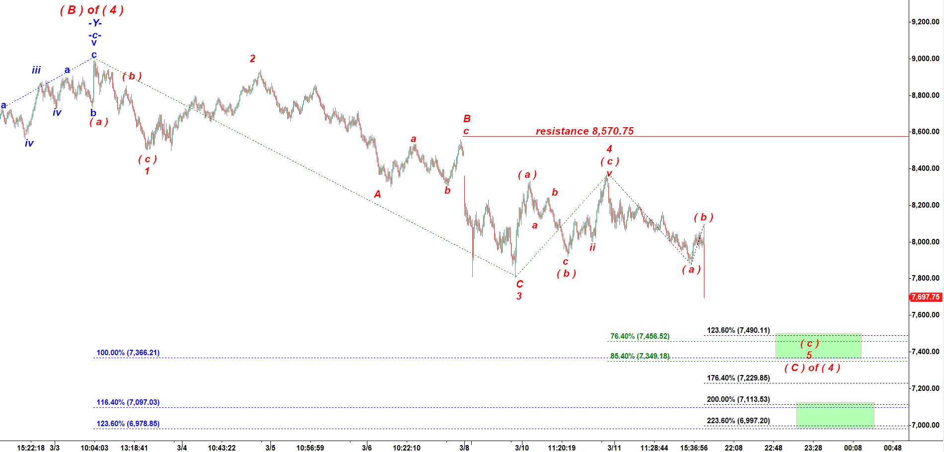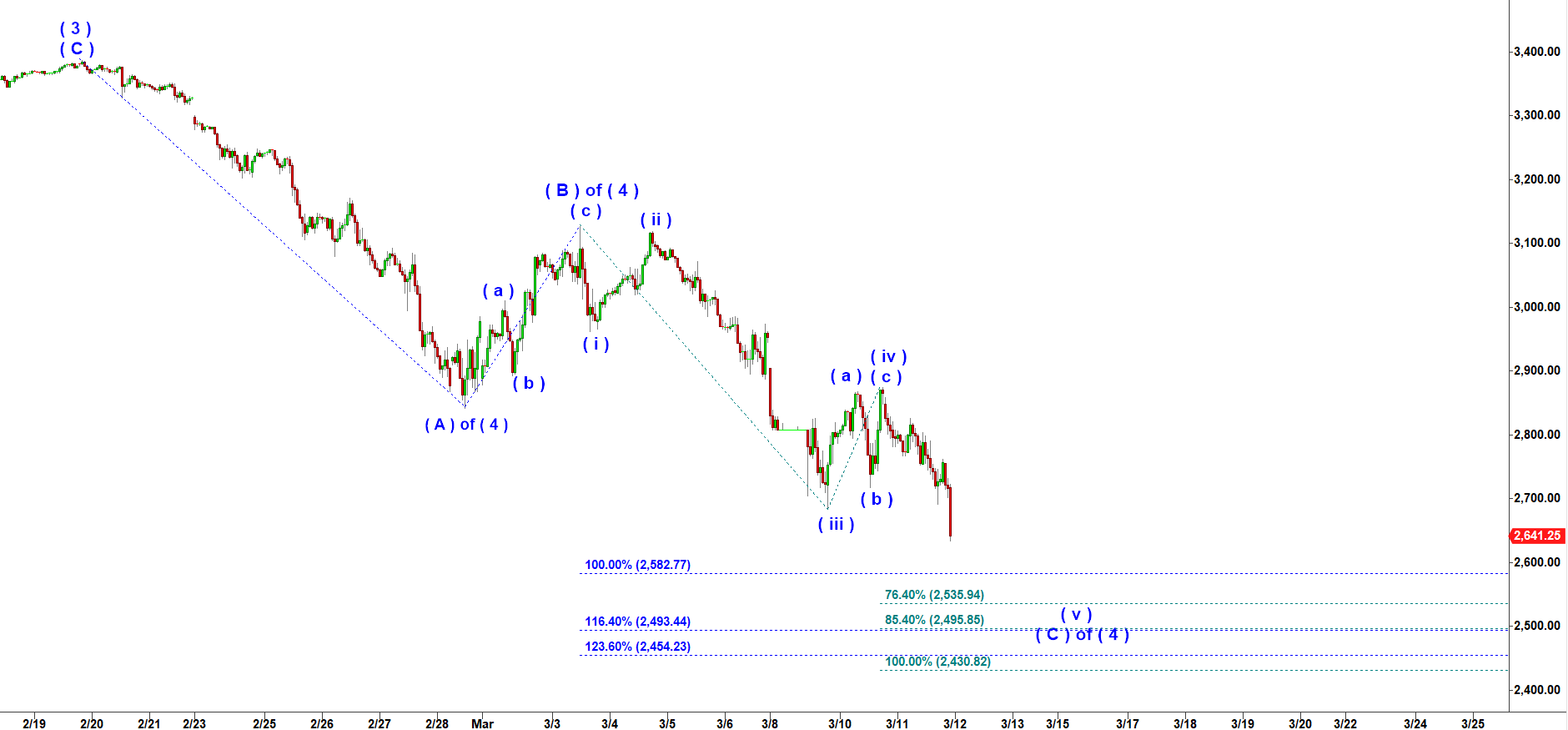 The good news is both NQ and ES have started the final stage of decline in subwave ( c ) of 5 of ( C ) of ( 4 ) down.