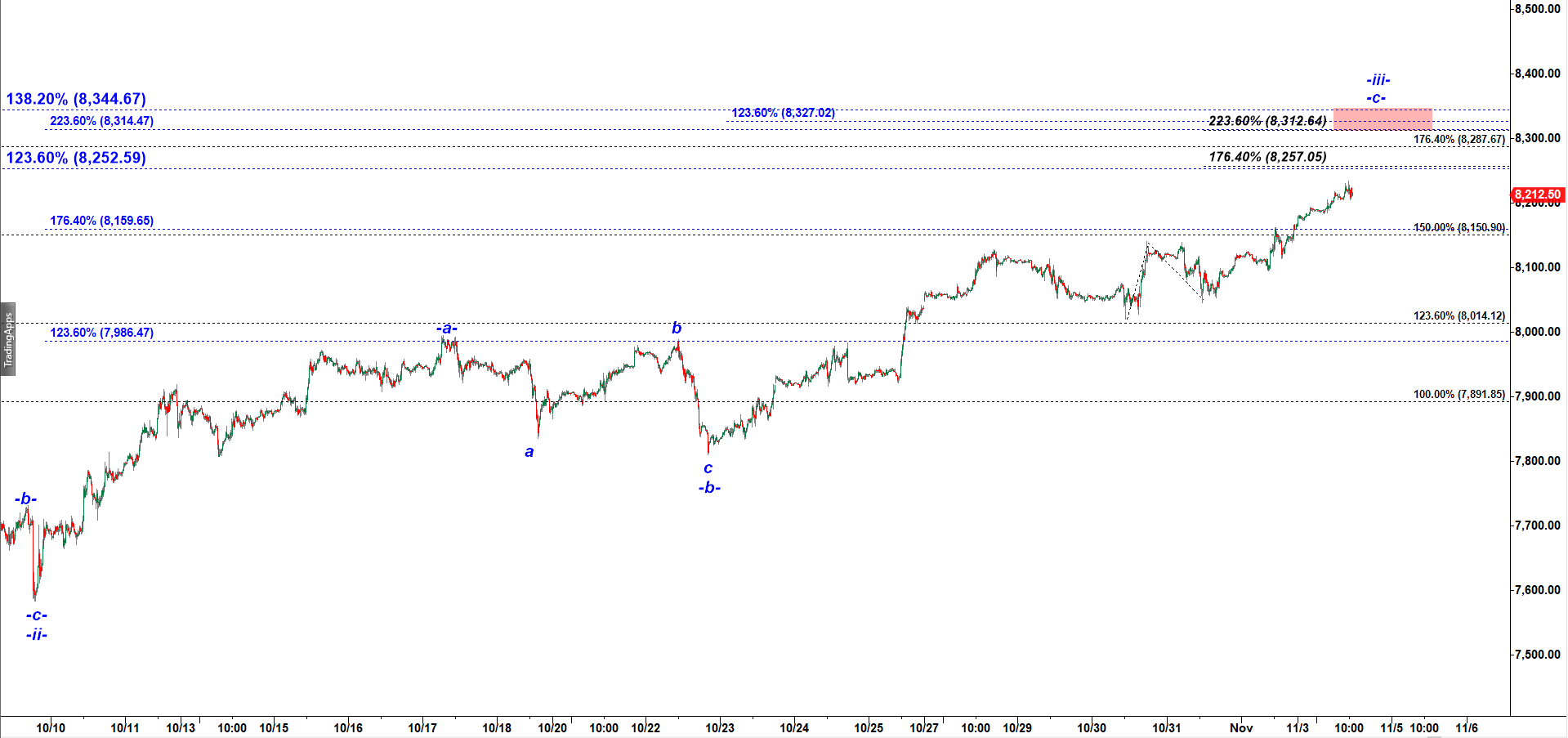 On a micro scale I see that this rally in subwave -c- of wave -iii- up may easily stretch to slightly over 8,300.
