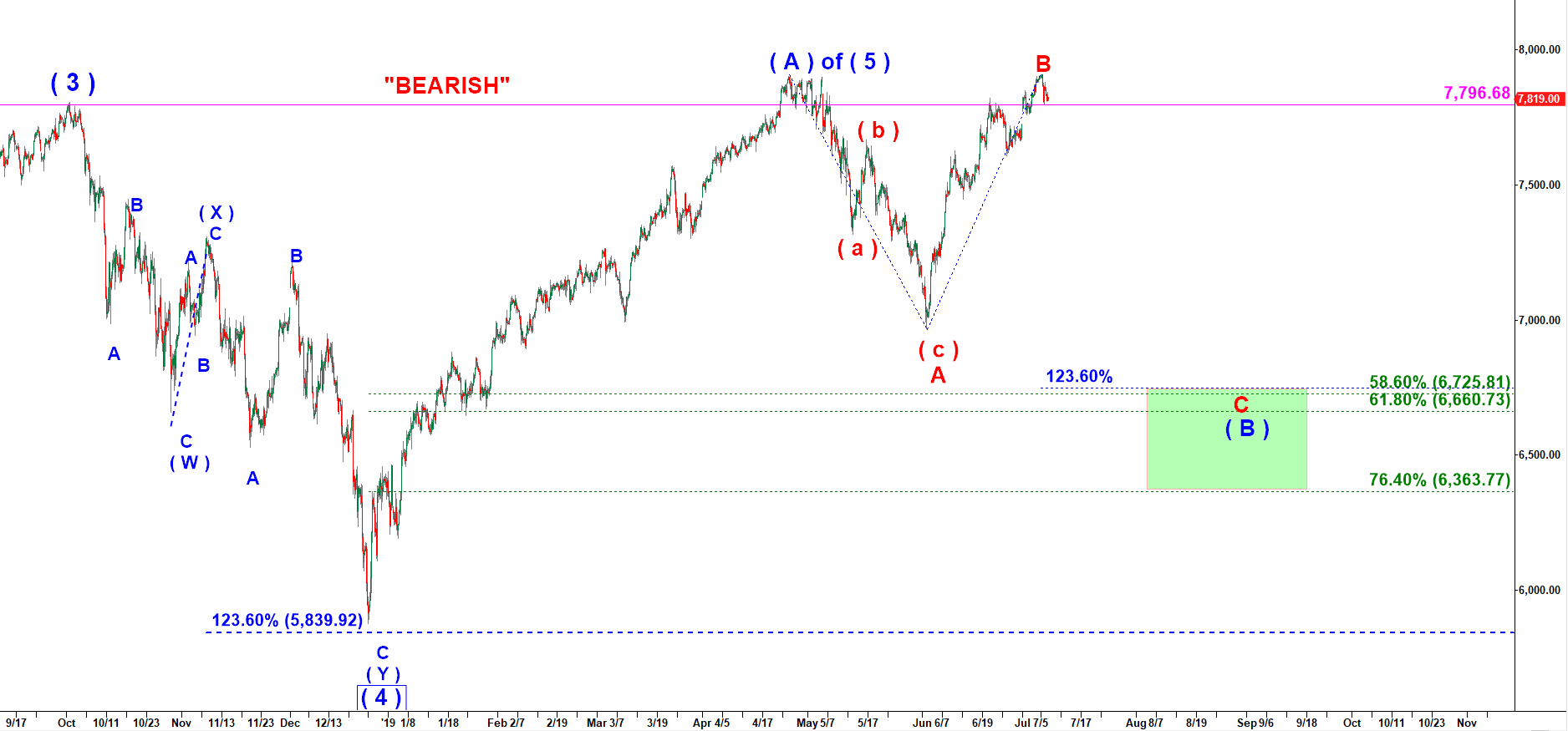 The “bearish” count below suggests a strong drop in wave c of ( B ) down.