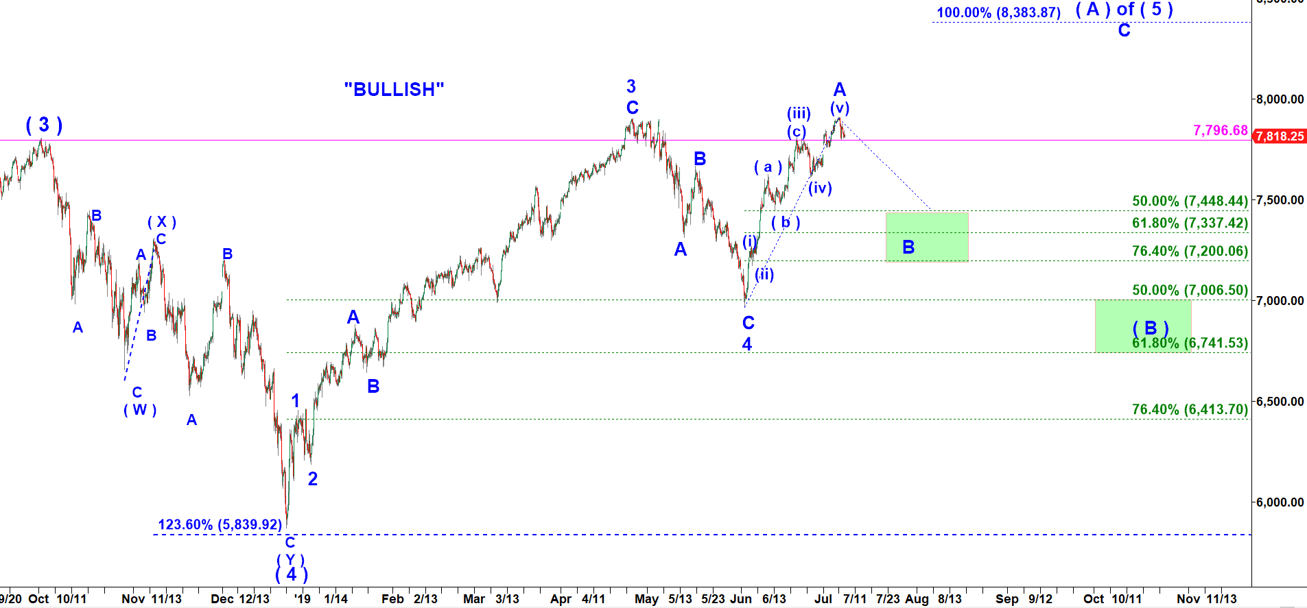 It assumes a large wave ( A ) of ( 5 ) up has topped at 7,905.50 on 25 Apr 2019.