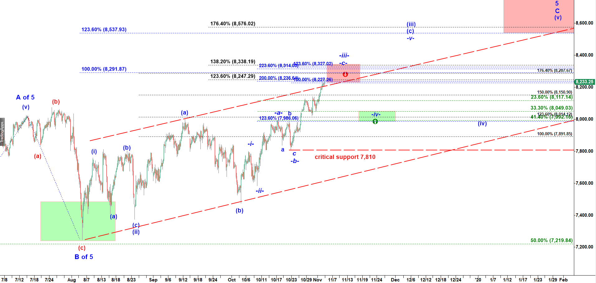 Hopefully it can get deeper into the Red Box at least up to 8,290 by market open. Then we may get a pullback in wave -iv- down targeting 8,050 – 7,950.