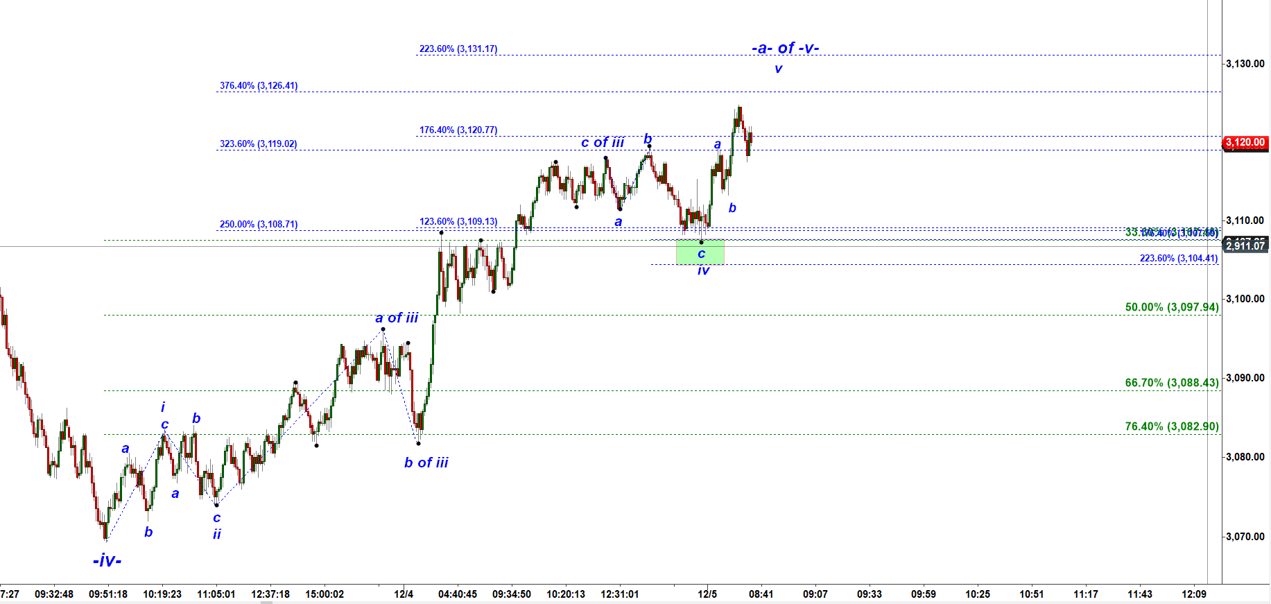 If we zoom-in and check a micro 4,500 tick bar chart we can see that ES has made enough micro waves to complete the first leg up in subwave -a- up of wave -v- up. Now it has play some corrective action in subwave -b- down. It can be quite shallow and find support at 3,097 – 3,088.