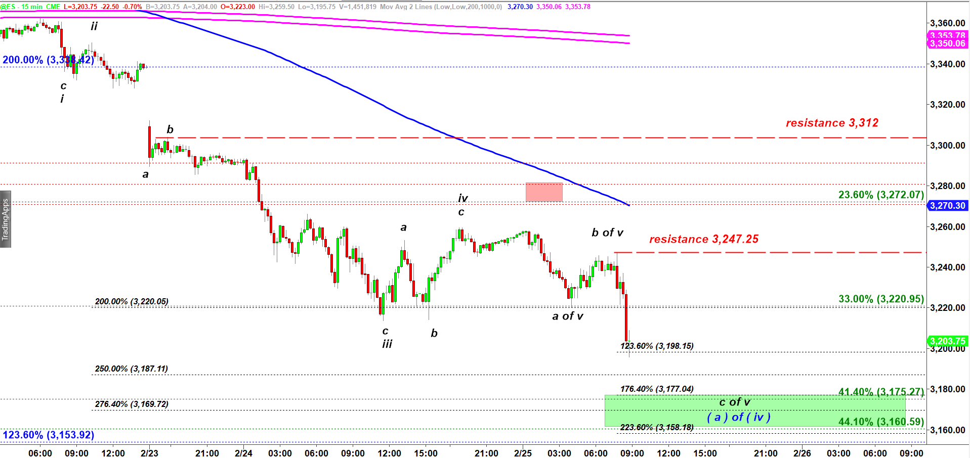 ES has made a lower low and subwave c of v tagged 123.6% ext of subwave a of v. It still can stretch lower into the Demand Zone.