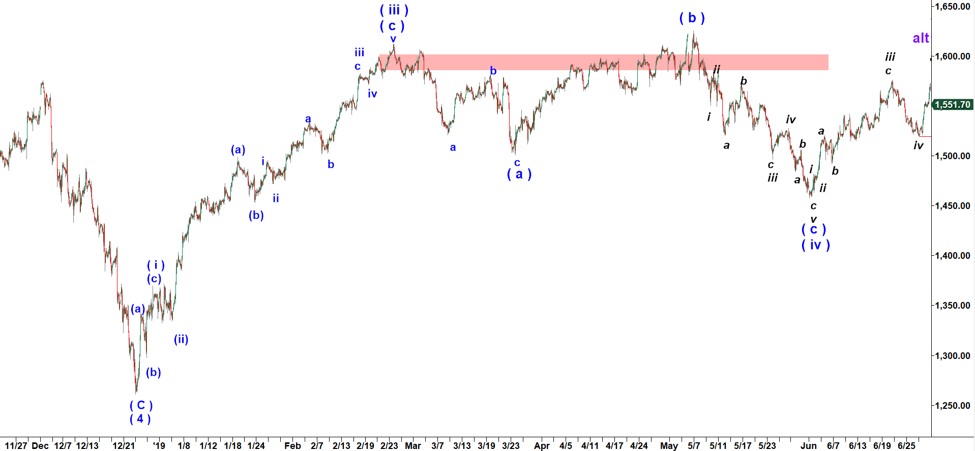 Path 1. The top made at 1,593.30 on July 1st, 2019 was the top of wave ( a ) up ( purple labels with prefix “alt” )