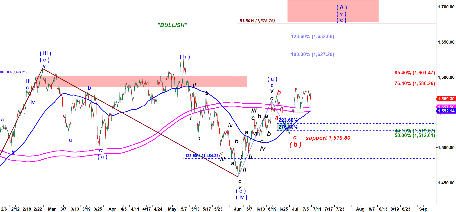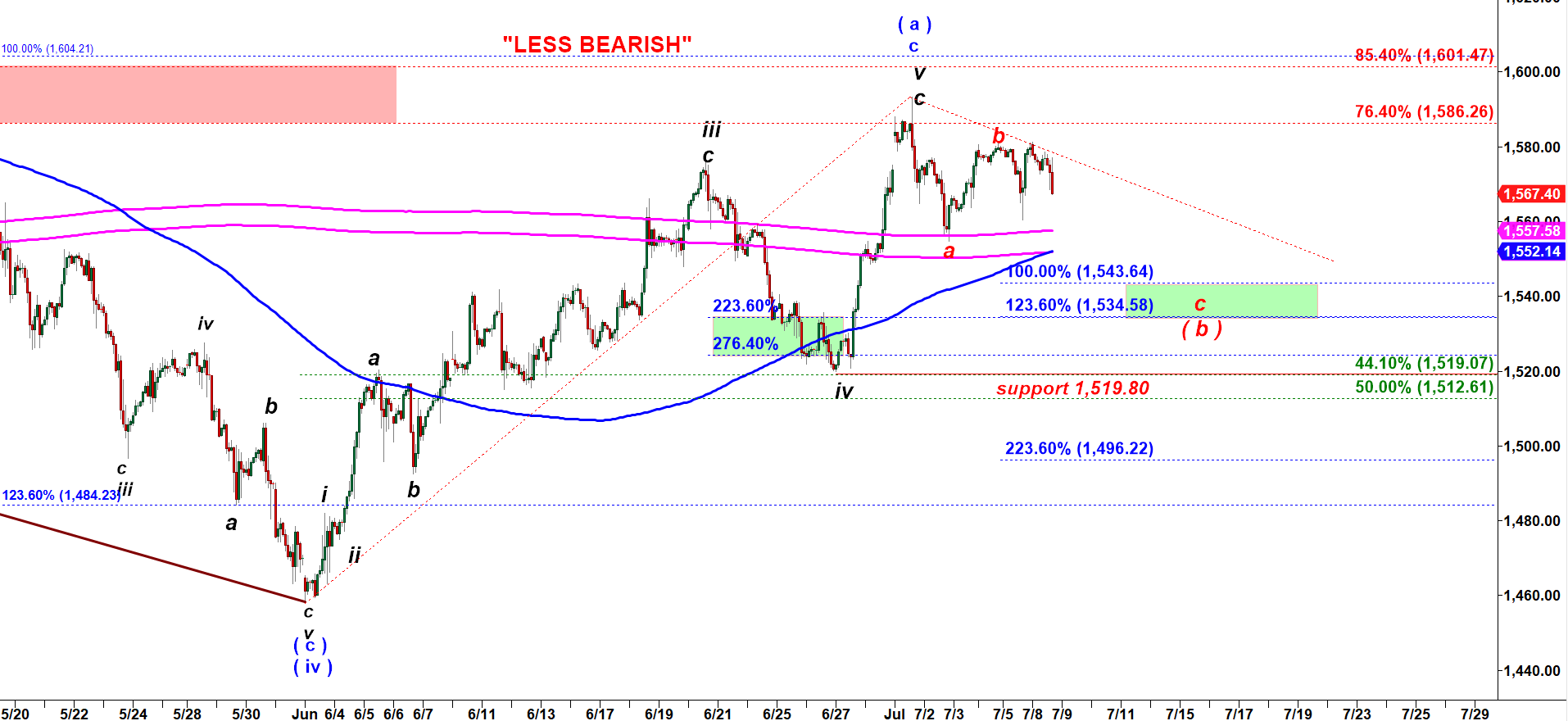 Moreover, even under the “Bearish” case that final wave c of ( b ) down may be quite short stretching to 100% – 123.6% of the first leg down in wave a of ( b ) (below). We may call it ‘Less Bearish”.
