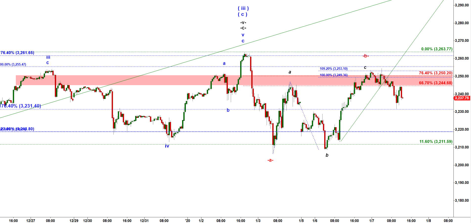 Off that lower low made at 3,206.75 ES played a textbook a-b-c corrective move up that made a lower high at 3,254.50.