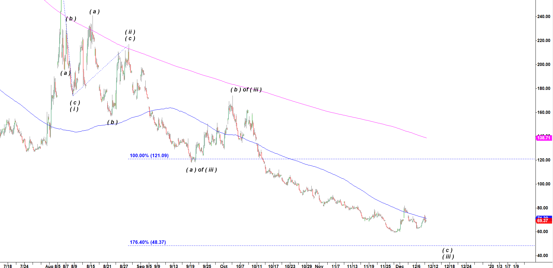 The previous pullback we got in TVIX at the beginning of Dec 2019 (from the low of 59.60 to the top of 81.80 ) is not big enough to be wave ( iv ) up.