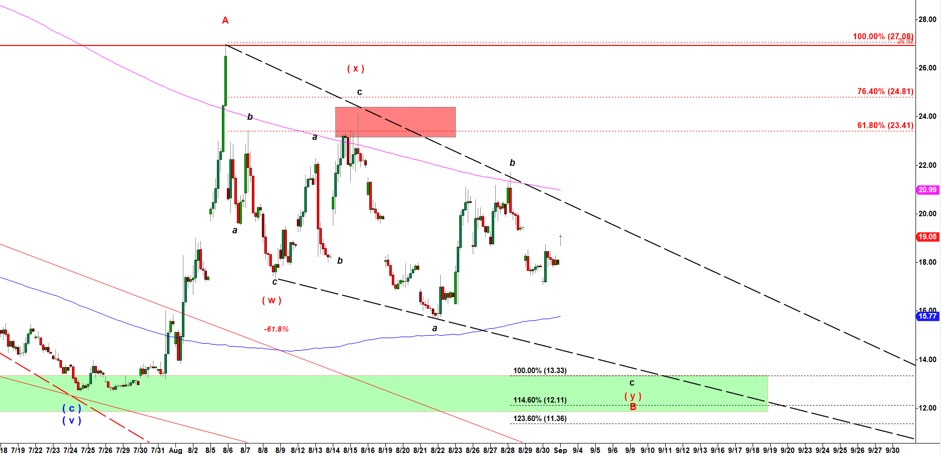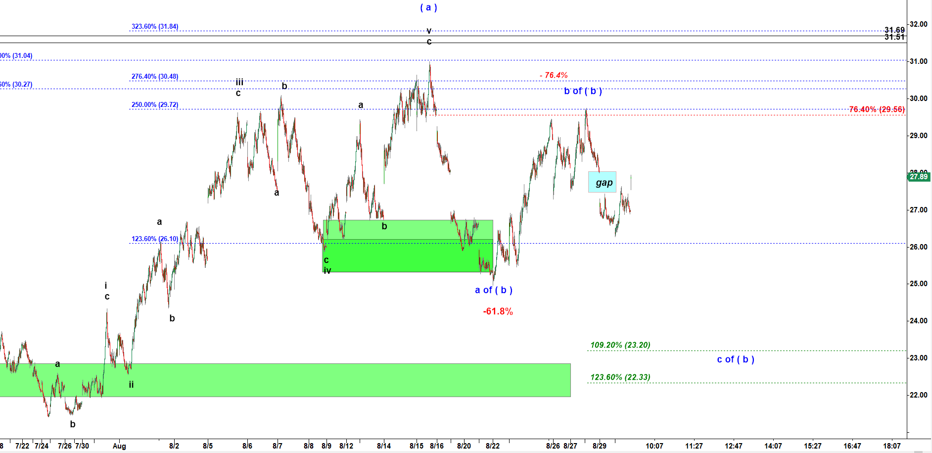 I still think that second leg down in subwave c of ( b ) down should make lower low under the low made by subwave a down ( 25.08 made on 8-22-2019 ).