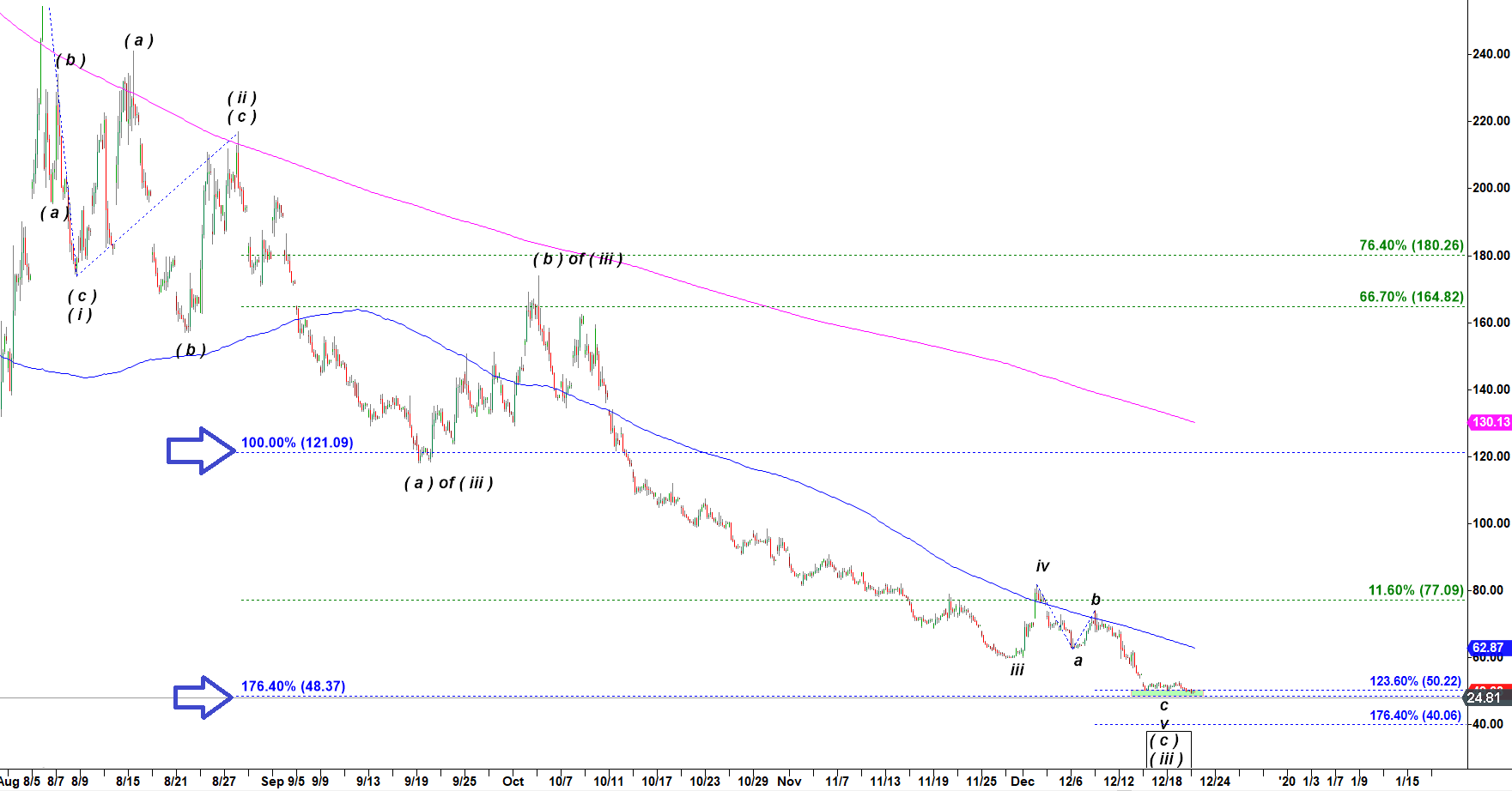TVIX is approaching a minimum target for wave ( iii ) down. Wave ( iii ) down has to stretch at minimum to 176.4% extension of wave ( ii ) down. That extension is located at 48.37.