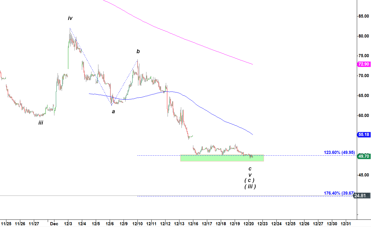 We can also zoom-in to 30 min chart to see a micro structure of the final subwave v of ( c ) of ( iii ). It now has a nice subdivision for a-b-c subwaves. And subwave c of wave v has already tagged a textbook 123.6% ext. If TVIX tags 48.37 that will satisfy all necessary conditions for the bottom of wave ( iii ) down. Once it happens we will be looking for signs of reversal. First of all we will be looking for confirmation of the reversal in the form of violation of previous corrective wave.